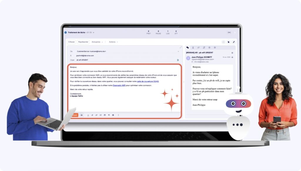 En combinant IA, live chat et expertise humaine, Kiamo et DialOnce offrent une expérience fluide pour le client et une productivité accrue pour vos équipes.