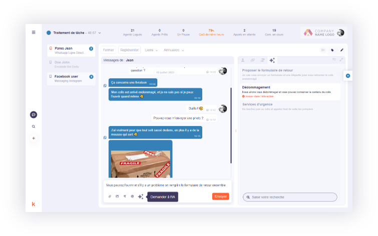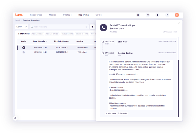 Les interactions sont intégrées et historisées dans Kiamo, assurant une vision unifiée du parcours client.